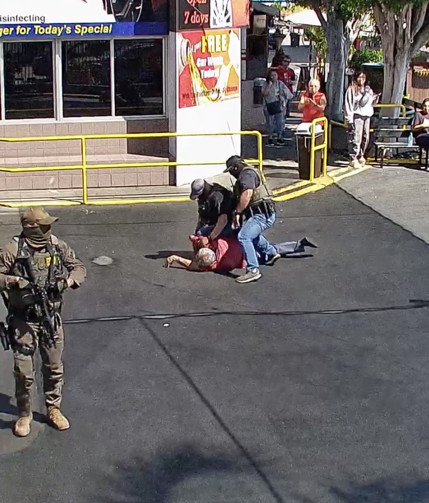 Las cámaras de seguridad del negocio grabaron cuando un agente encapuchado de ICE empujó a Shouhed. Esto sucedió mientras él intentaba saber qué pasaba con sus empleados. El impacto lo lanzó contra una puerta y lo dejó tendido en el suelo. Minutos después, varios oficiales lo sometieron con demasiada fuerza en el estacionamiento. Le retorcieron los brazos, aunque el hombre gritaba que acababa de tener una cirugía de corazón.