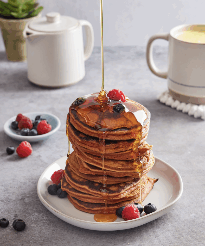 Sirve con miel de maple o miel de abeja y frutas frescas.