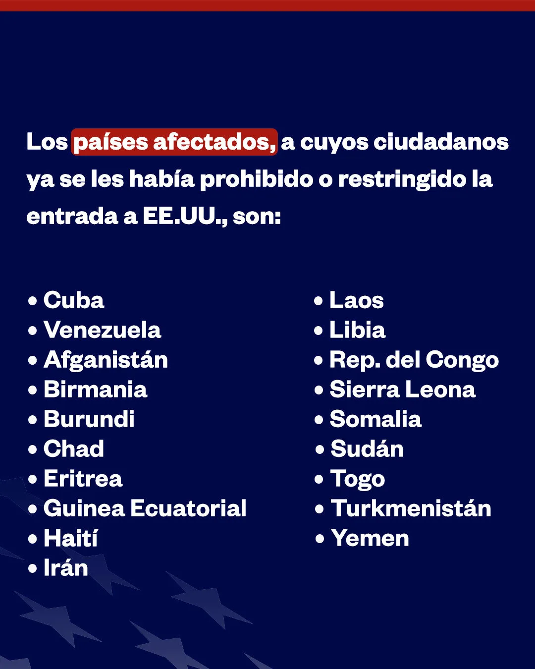 La lista incluye naciones de alto riesgo. Entre ellas: Afganistán, Myanmar, Chad, República del Congo, Guinea Ecuatorial, Eritrea, Haití, Irán, Libia, Somalia, Sudán, Yemen, Burundi, Cuba, Laos, Sierra Leona, Togo, Turkmenistán y Venezuela. Estas ya tenían restricciones desde junio.